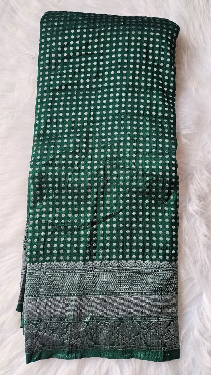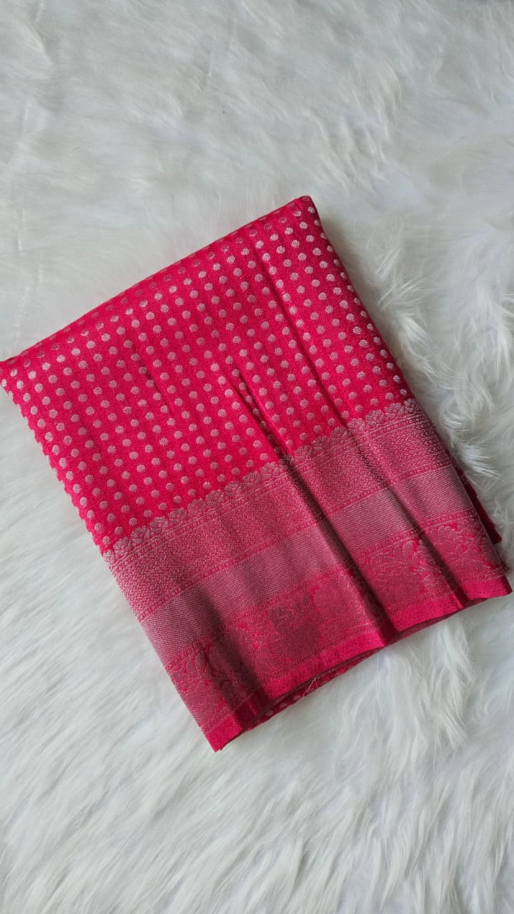This exquisite Georgette Banaras saree features an all over intricate Zari weave design that exudes elegance and sophistication.