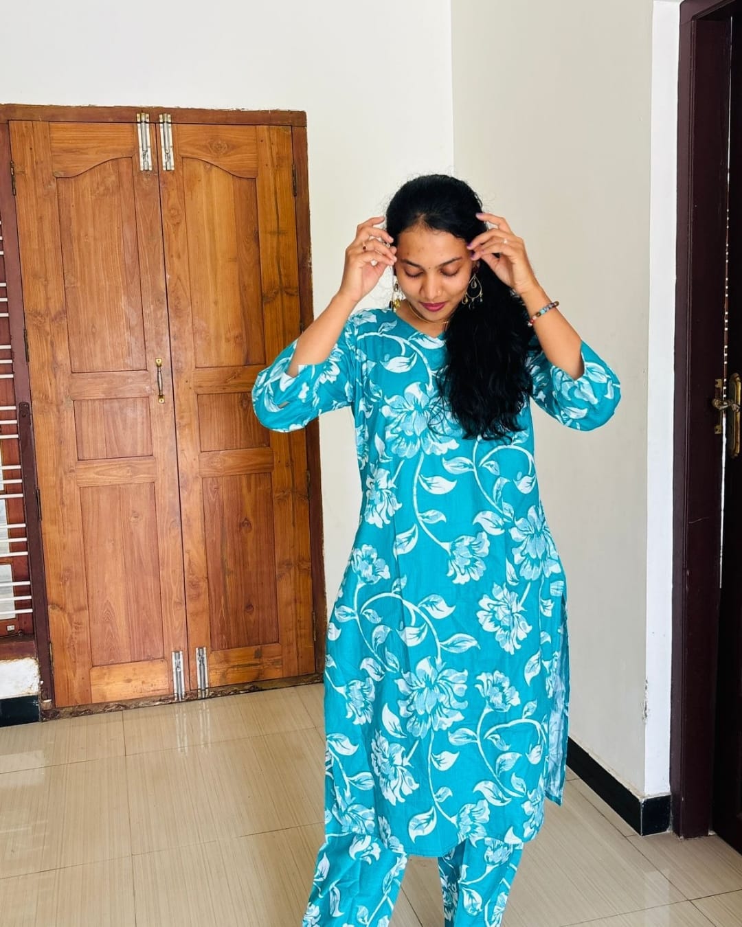 A beautiful kurta set crafted in a soothing green shade with delicate white floral prints. Made from soft cotton fabric, it offers excellent comfort and breathability for all-day wear. The 3/4th sleeves and straight-cut design give it a classy and graceful look. Perfect for daily wear, office use, and casual gatherings