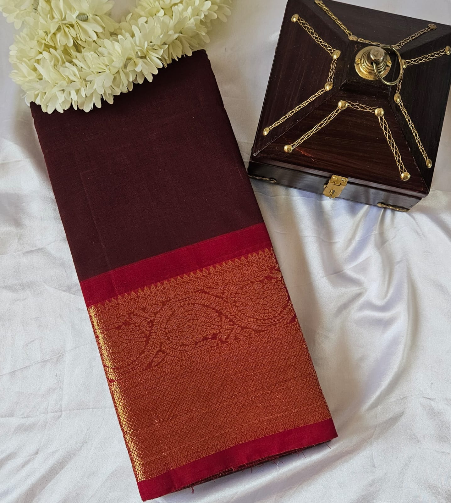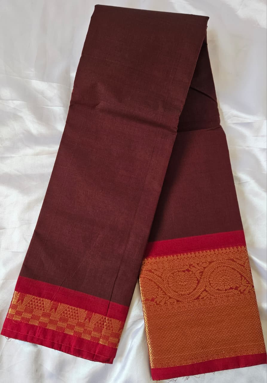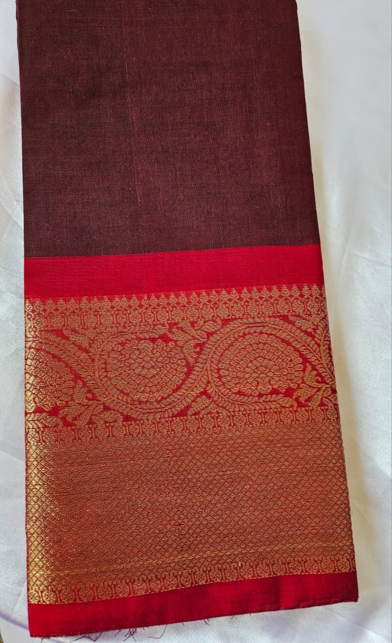 Elegant Kanchi Cotton saree with a beautiful brown and marron combination, finished with a rich zari border. A prefect blend of tradition and grace