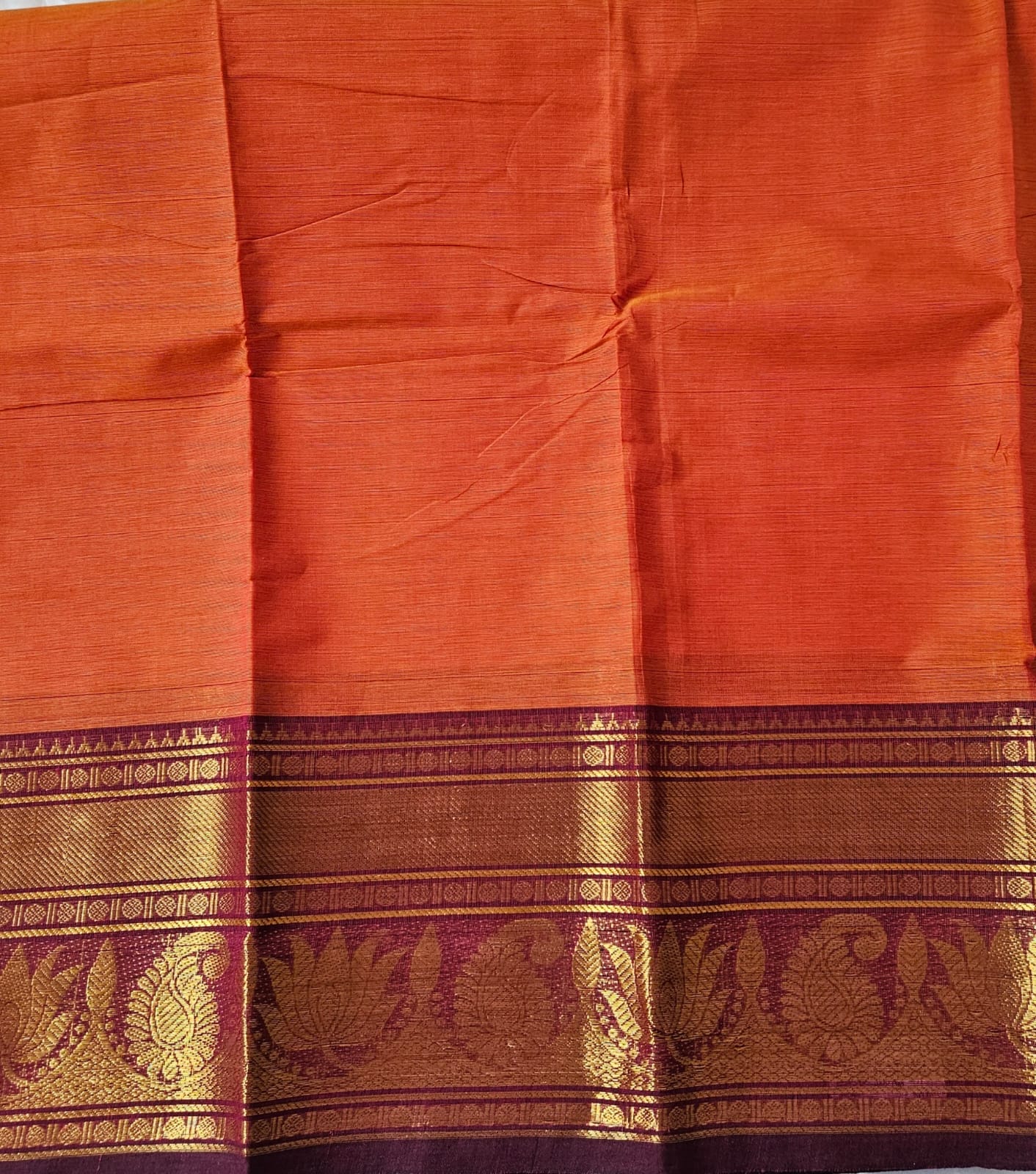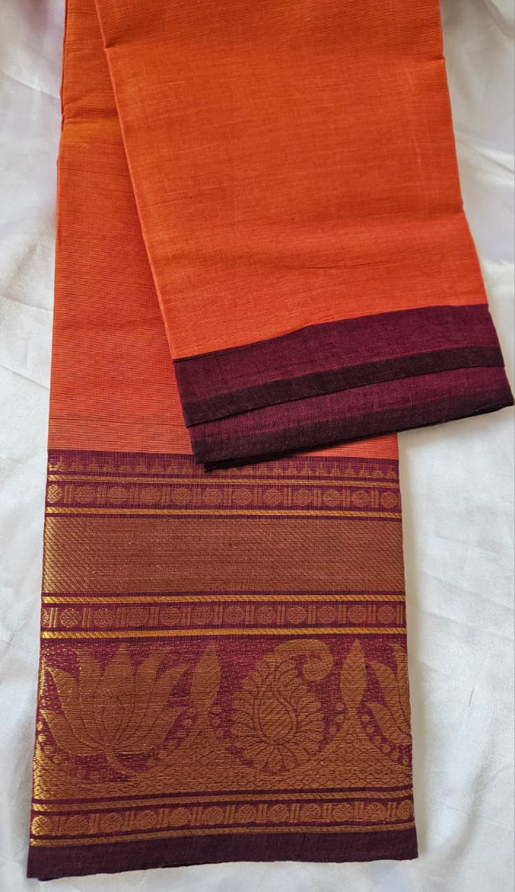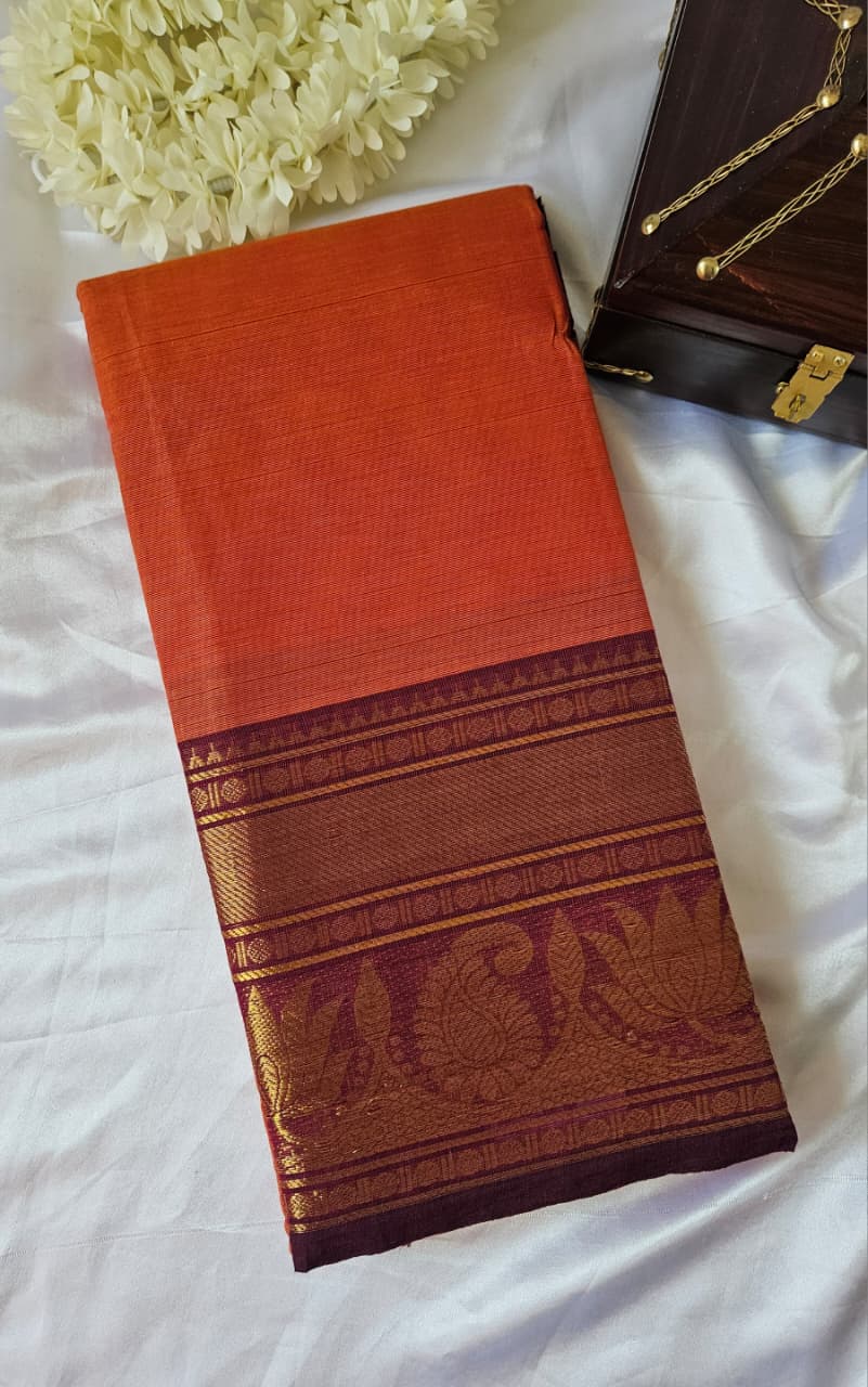 Elegant Kanchi Cotton saree with a beautiful rust and brown combination, finished with a rich zari border. A prefect blend of tradition and grace