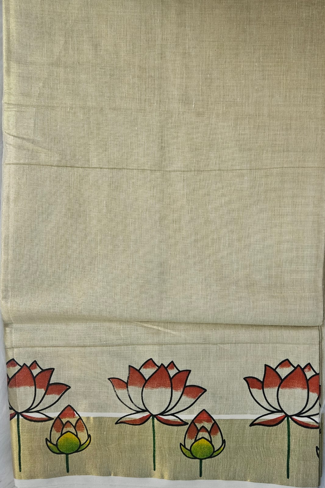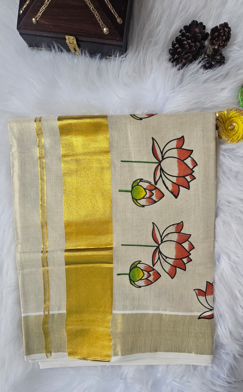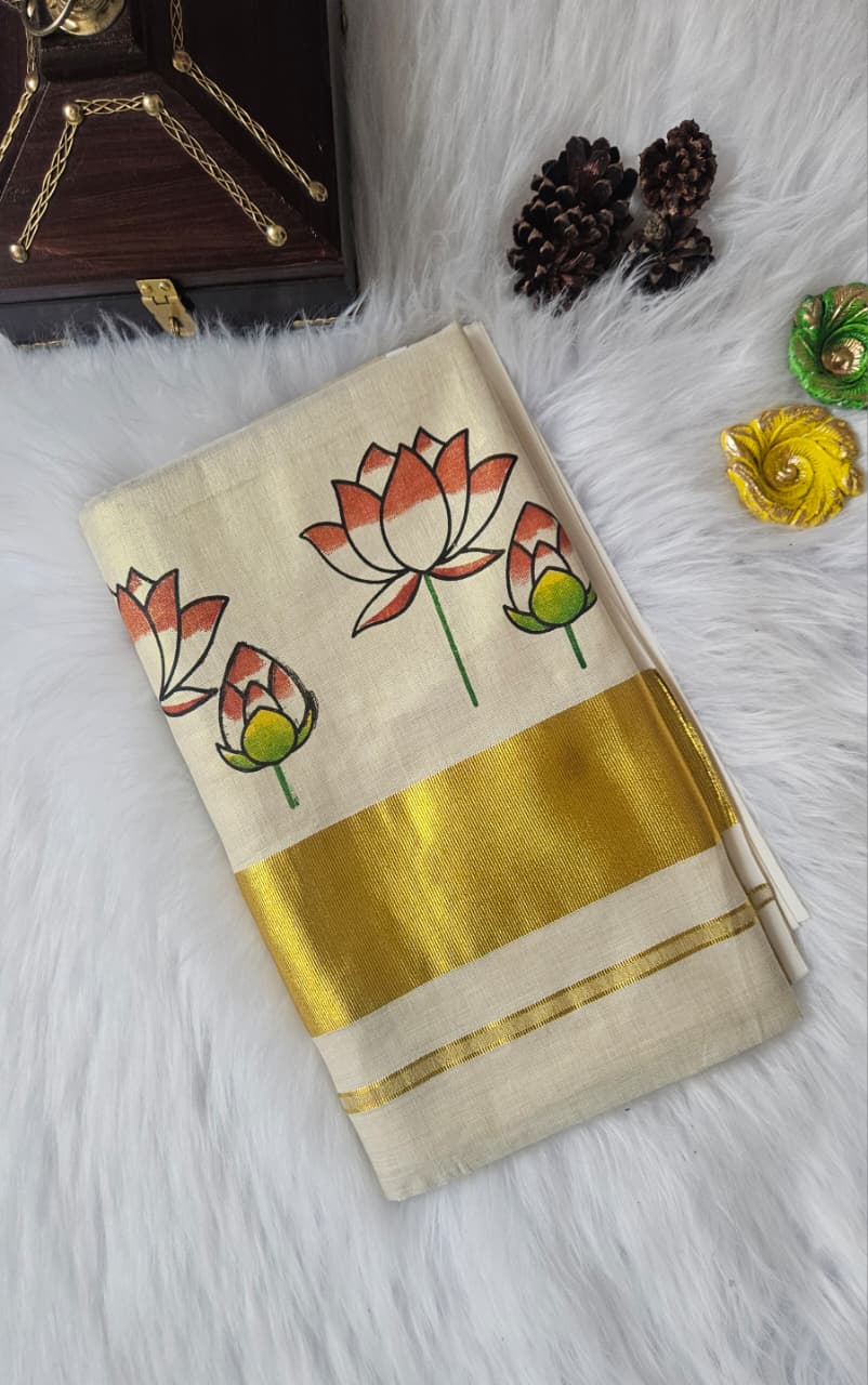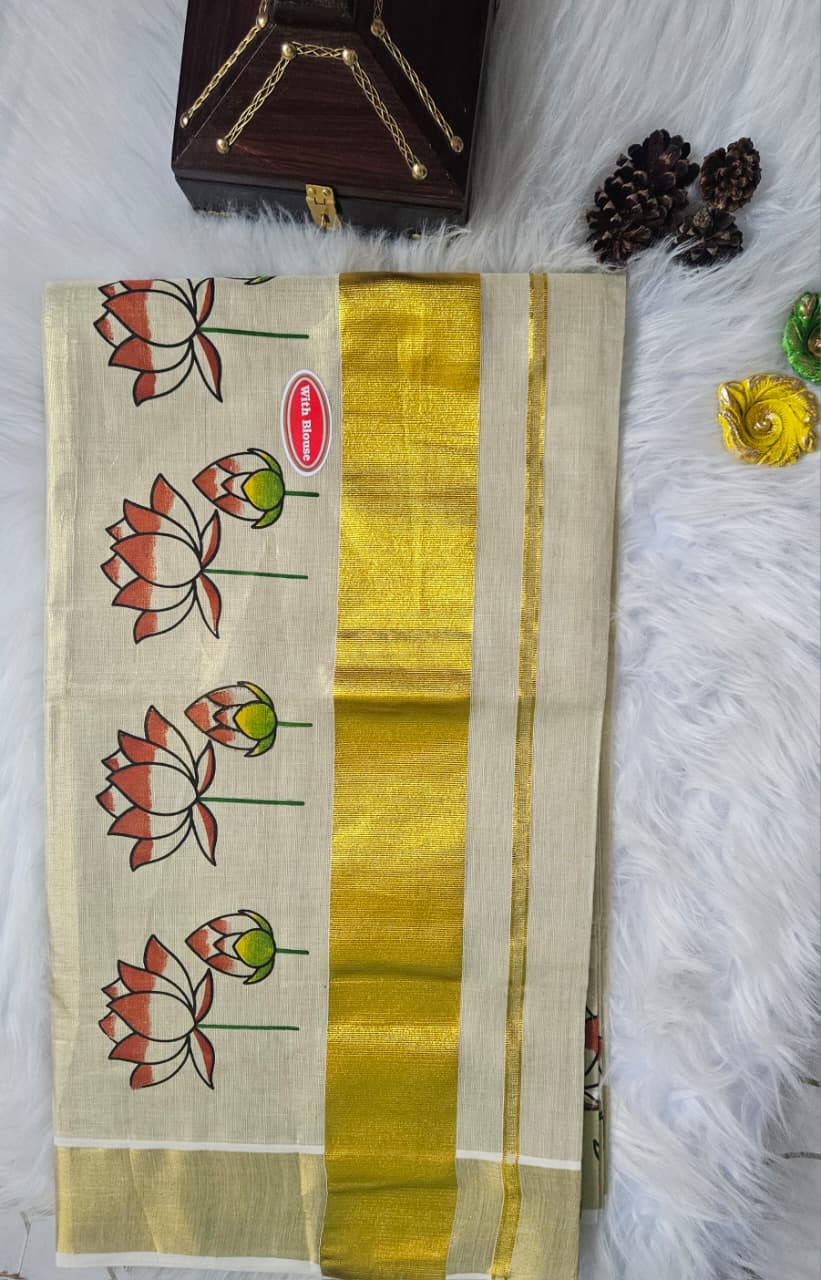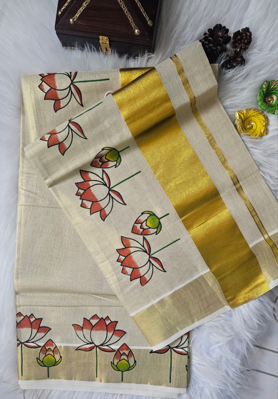 Lotus Kasavu Kerala Saree – Adorned with a graceful lotus motif