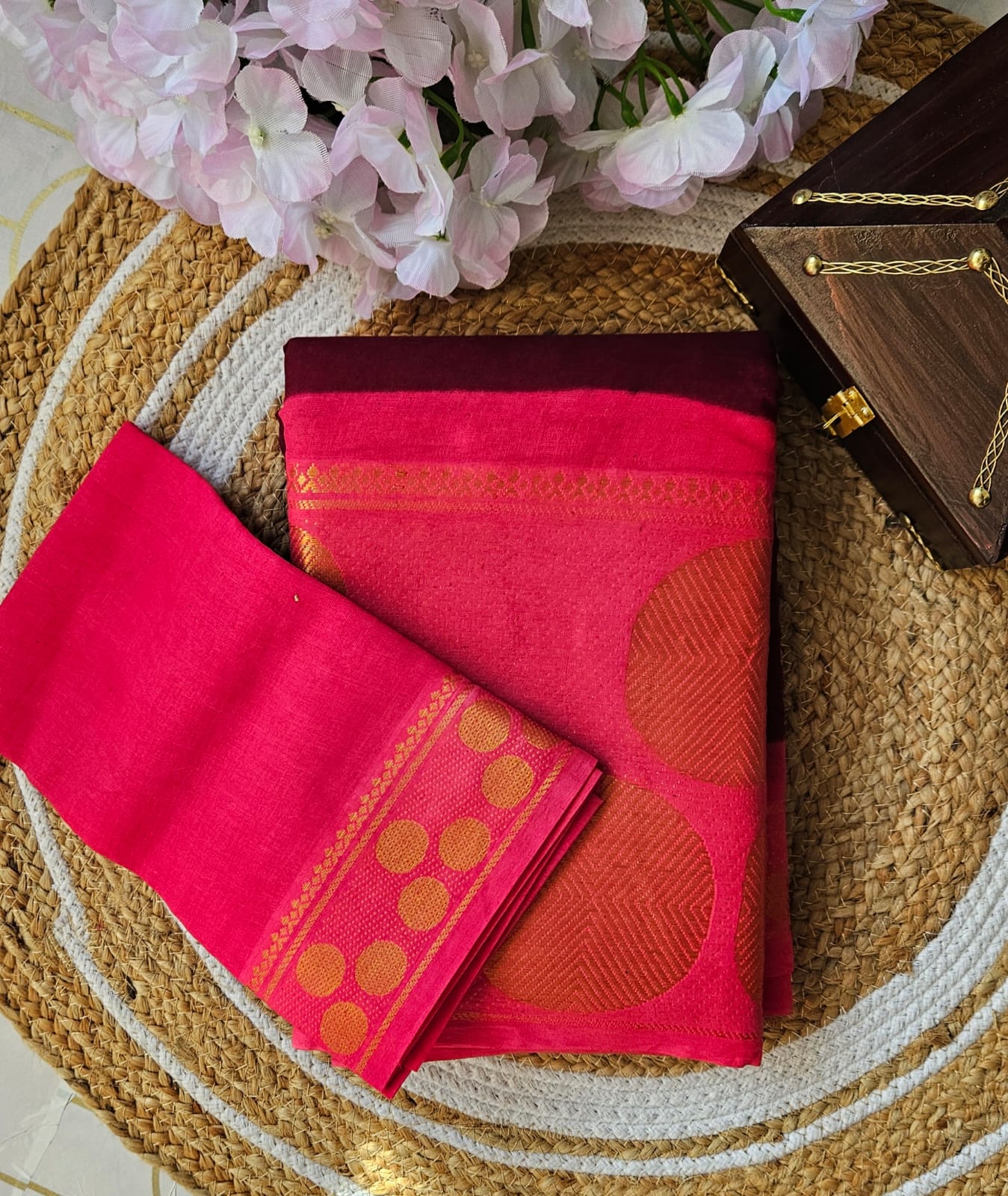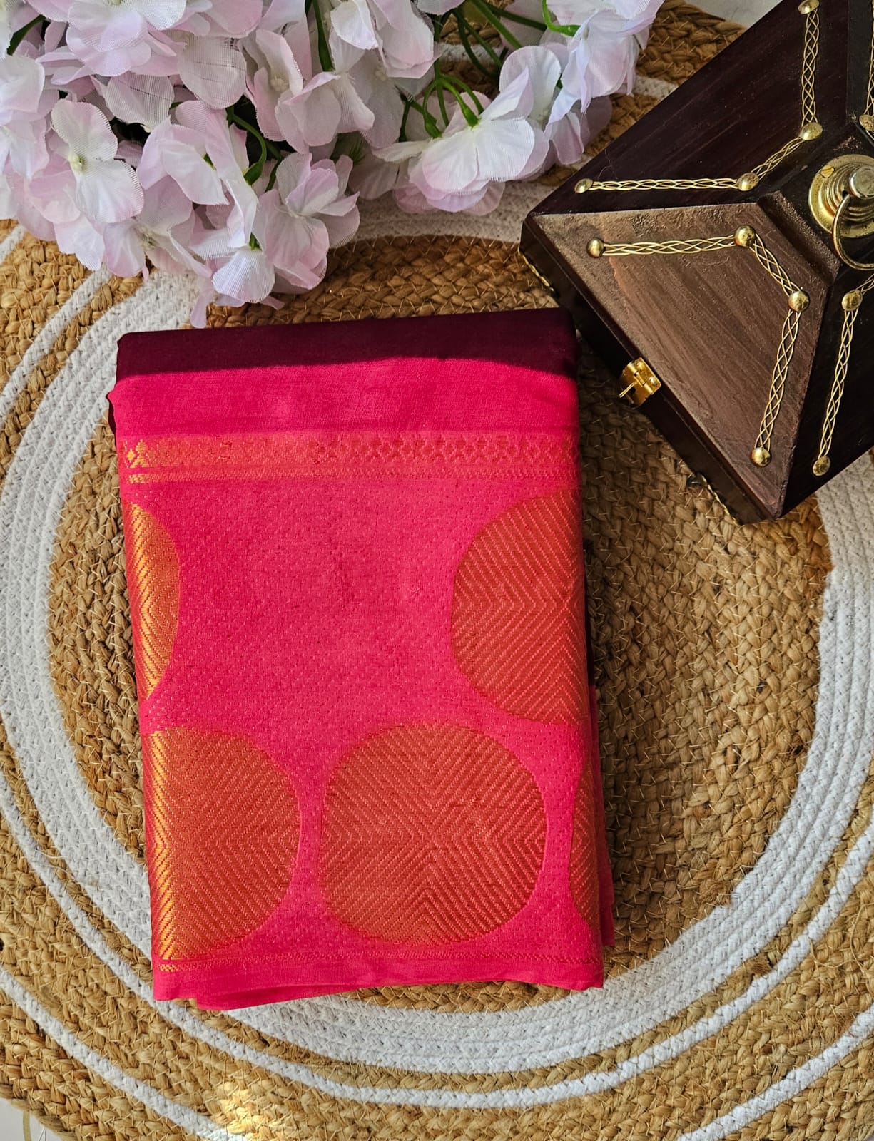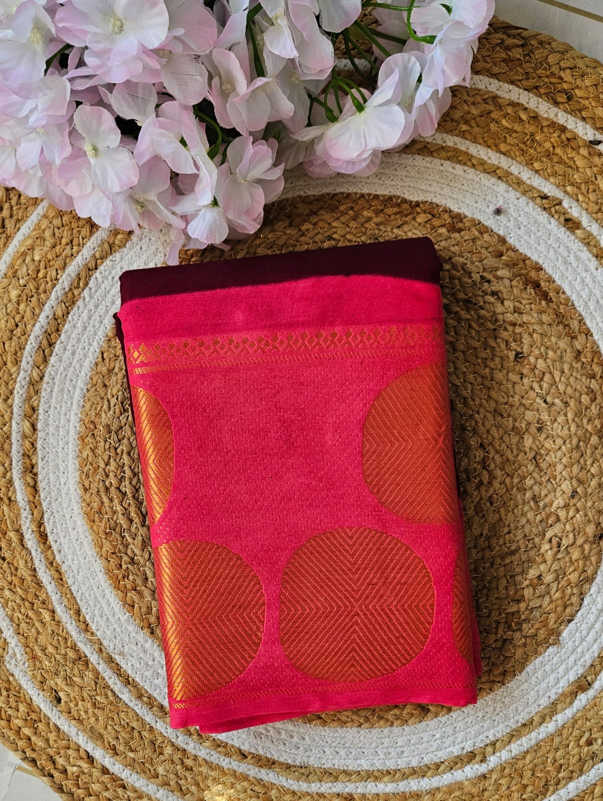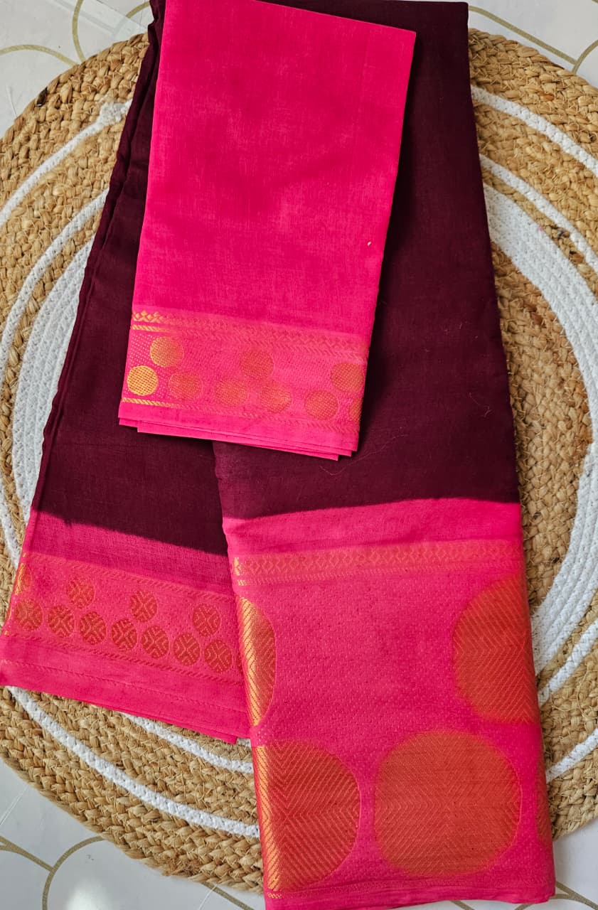 Maroon full-plain Madhurai sungudi cotton saree, contrast zari round motif big border, lining seer pallu & plain pink blouse