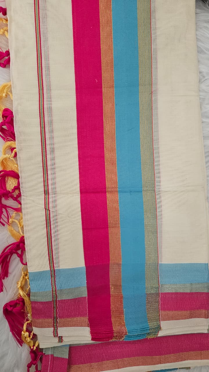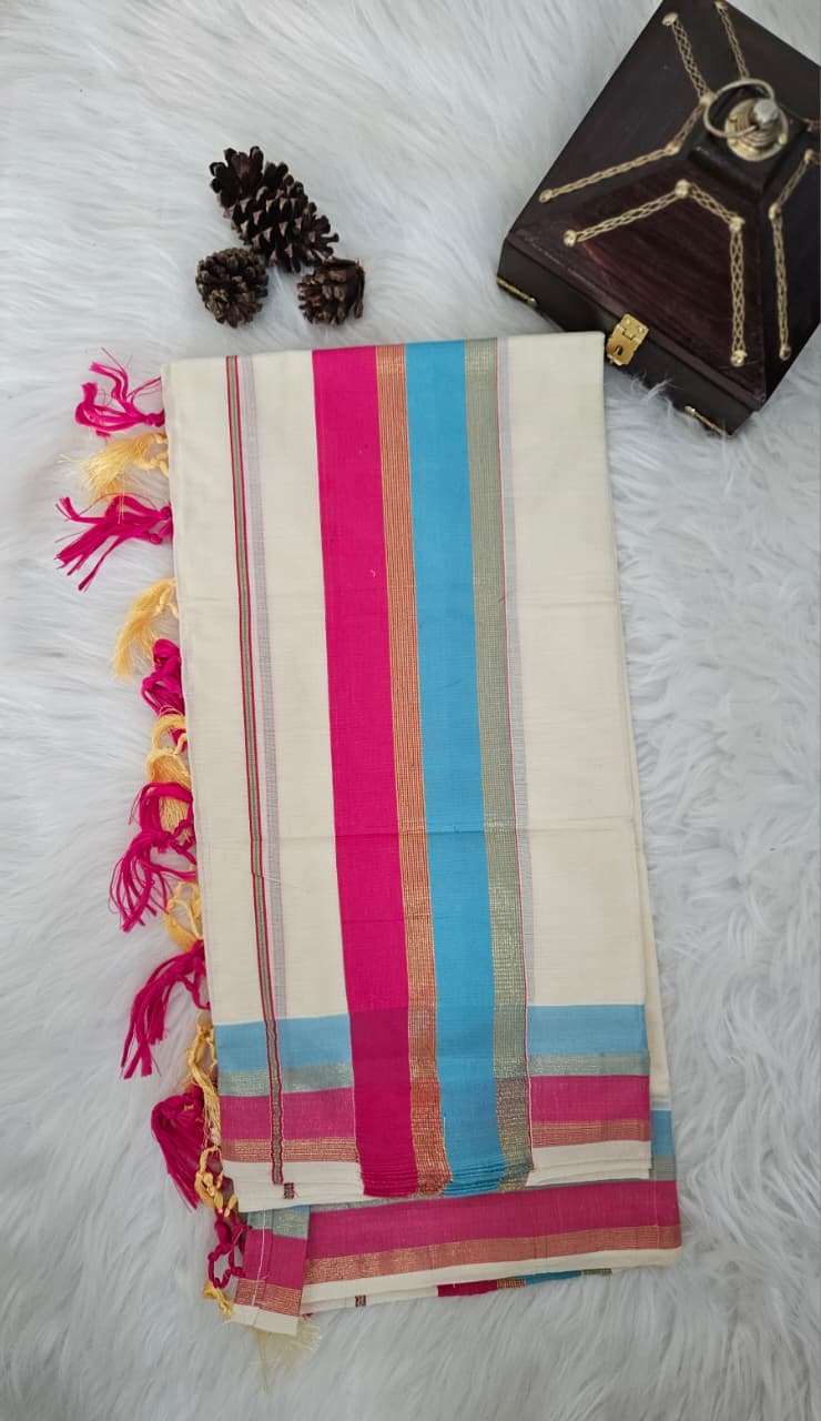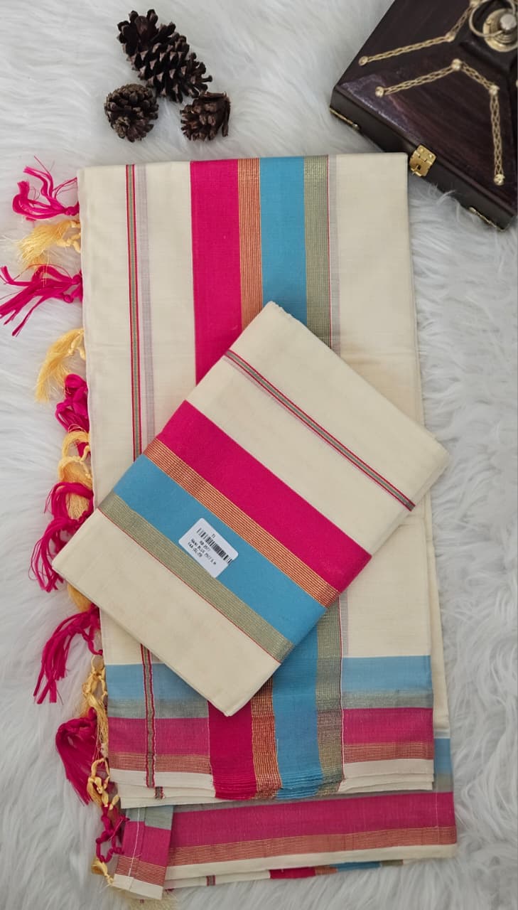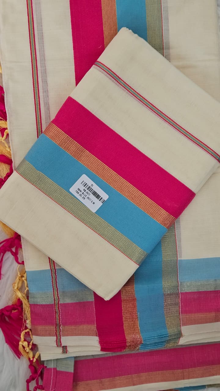 Rani and blue and Golden zari border Set mund and Tassles