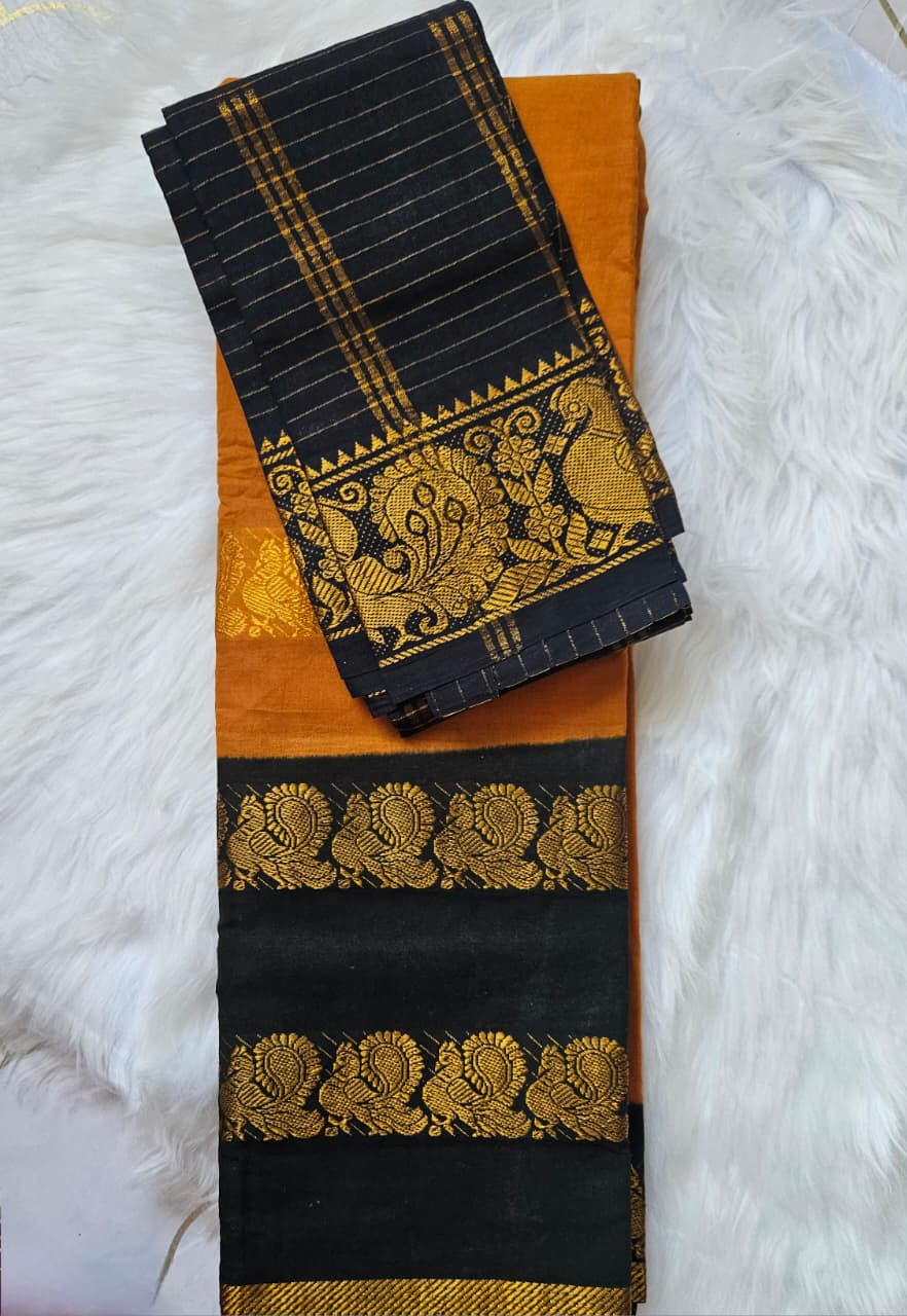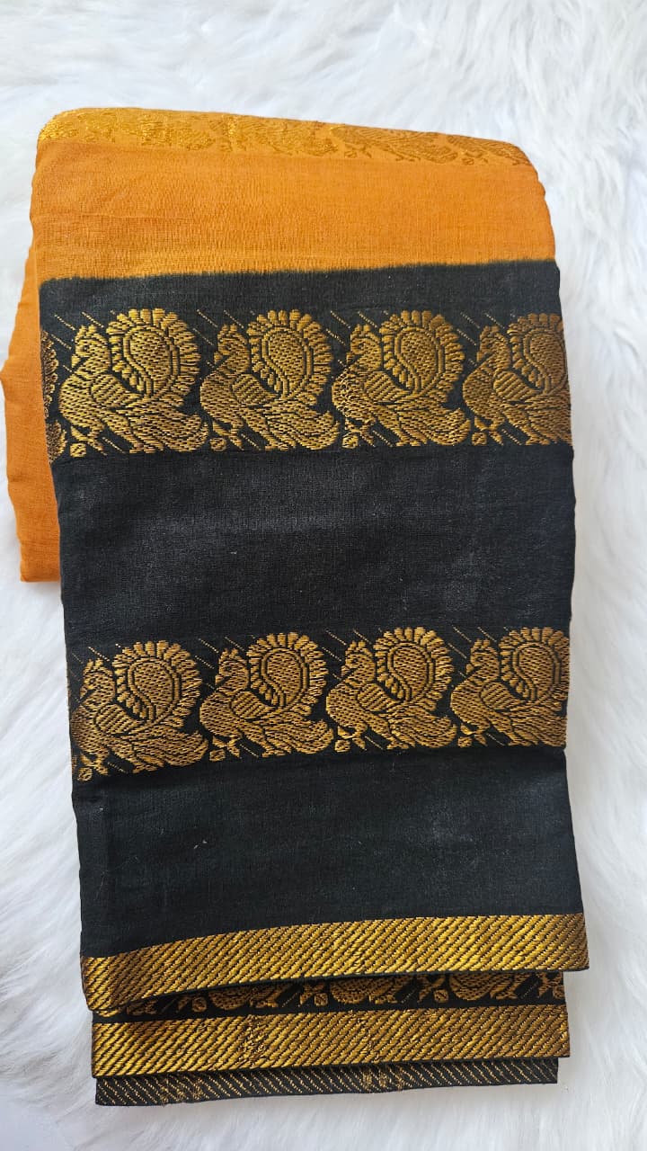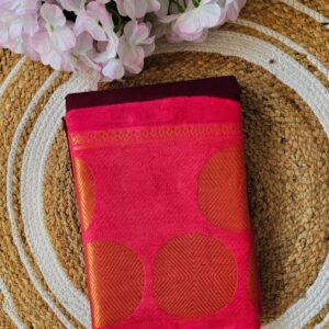 Yellow full-plain Madhurai sungudi cotton saree, contrast zari round motif big border, lining seer pallu & plain pink blouse